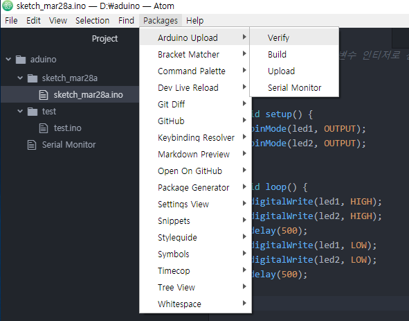 검색하면 나오는 아두이노 아톰 패키지는 다양하게 있지만 가장 다운로드수가 많은 arduino-upload를 설치하도록 하겠습니다.