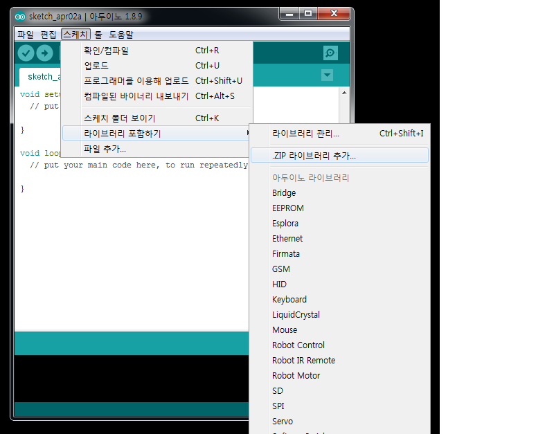 메뉴 - 스케치 - 라이브러리 포함하기 - ZIP 라이브러리 추가