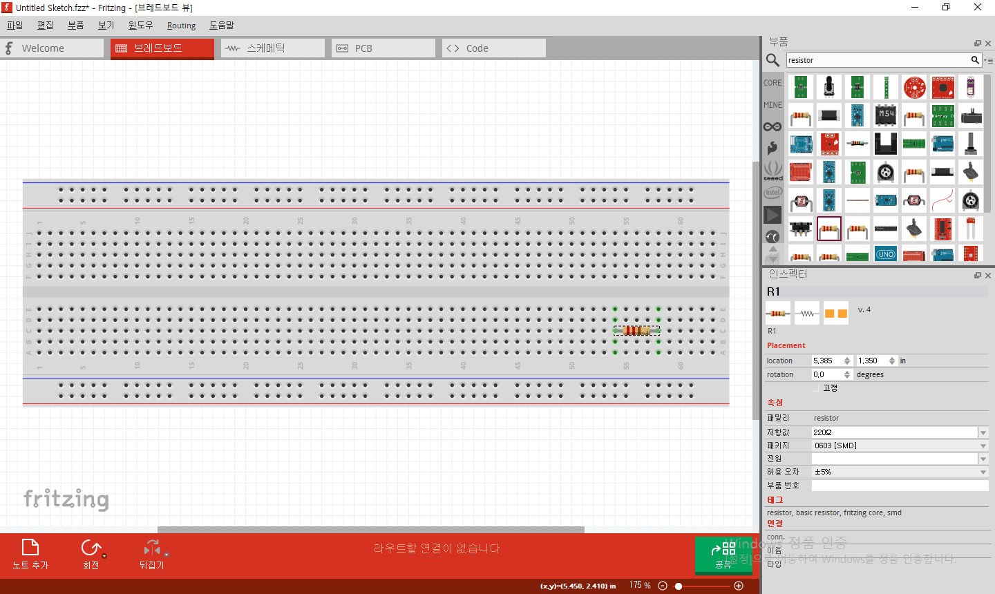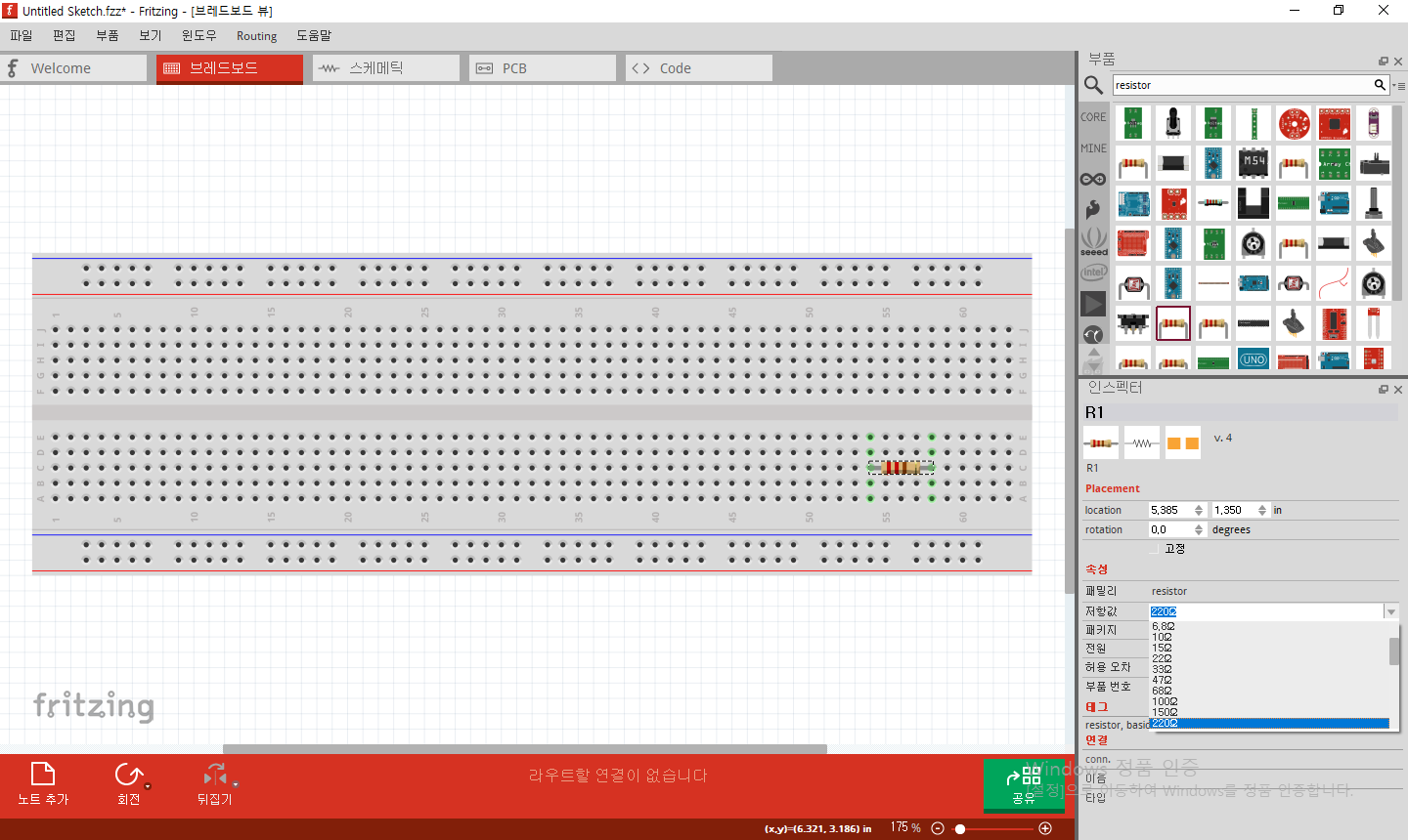 Fritzing을 실행하고 저항을 검색하면 위와 같이 나옵니다.
