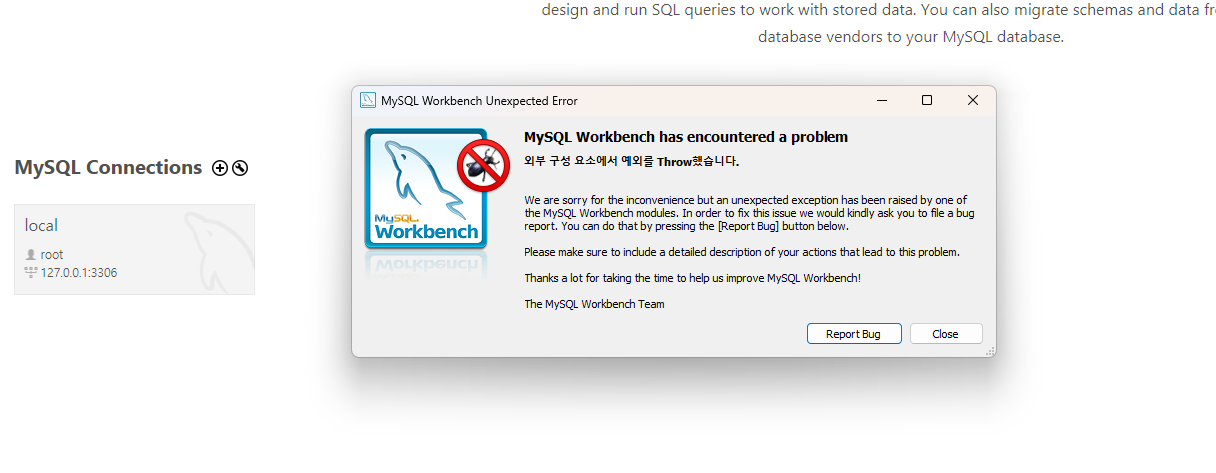 사이드 프로젝트를 위해 이전에 설치해 둔 워크밴치를 실행 하려고 하니 "mysql workbench has encounterde a problem 외부 구성 요소에서 예외를 Throw 했습니다." 경고문이 노출되어 이걸 해결하도록 해보겠습니다.