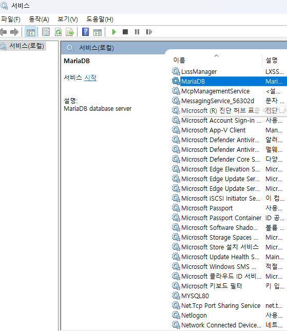 서비스에서 mariaDB가 실행 중이고 mysql80이 중지되어 있는 것을 확인 그럼 mariaDB를 사용하지 않으니 중지해 주고 mysql80(mysql)을 실행해줍니다.